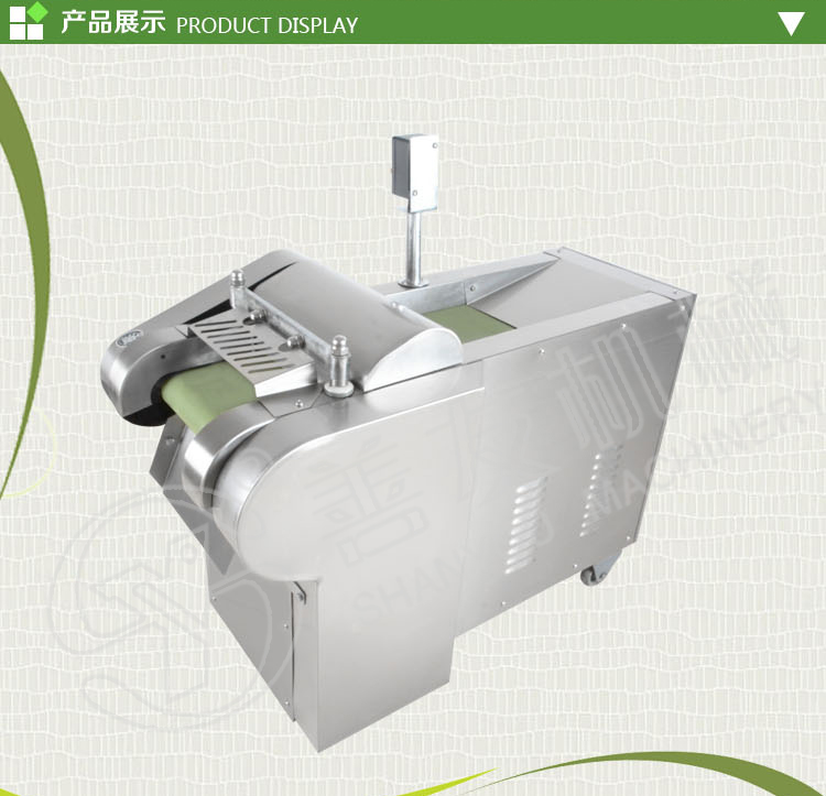 多用切菜机工作原理: 主要由机架,输送带,压菜带,切片机构,调速箱或塔轮调速机组成,用于瓜薯类硬菜的切片,片厚可在一定范围内自由调节,竖刀部分可将叶类软菜或切好的片加工成不同规格的块,丁,菱形等各种形状。切菜长度通过“可调偏心轮”在一定范围内任意调整。因竖刀模拟手工切菜原理,加工表面平整光滑,成型规则,被切蔬菜组织完好,保持新鲜。