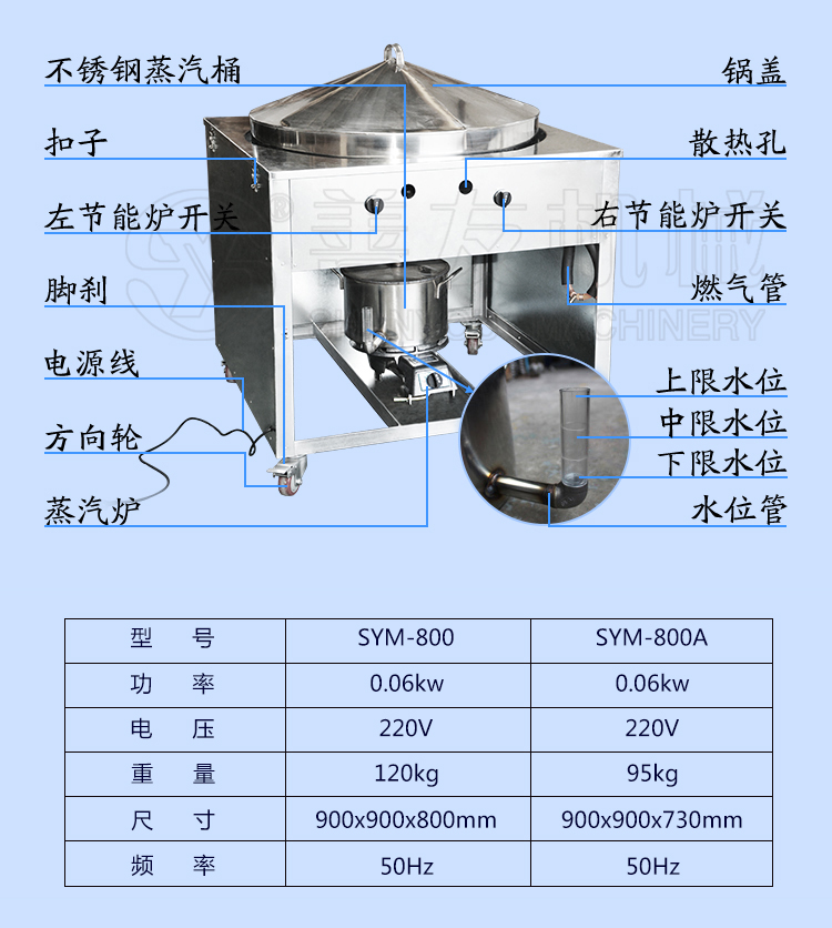 2、采用专业不锈钢无压力蒸汽锅,可以观察锅内水量多少,不会缺水干烧,加水方便、产汽快、干净卫生。