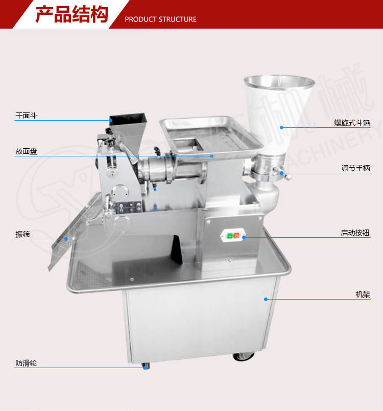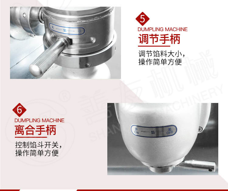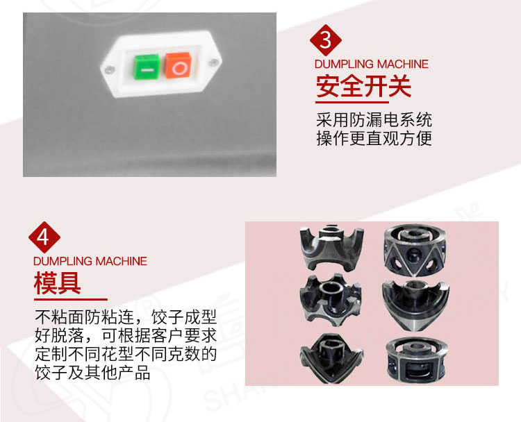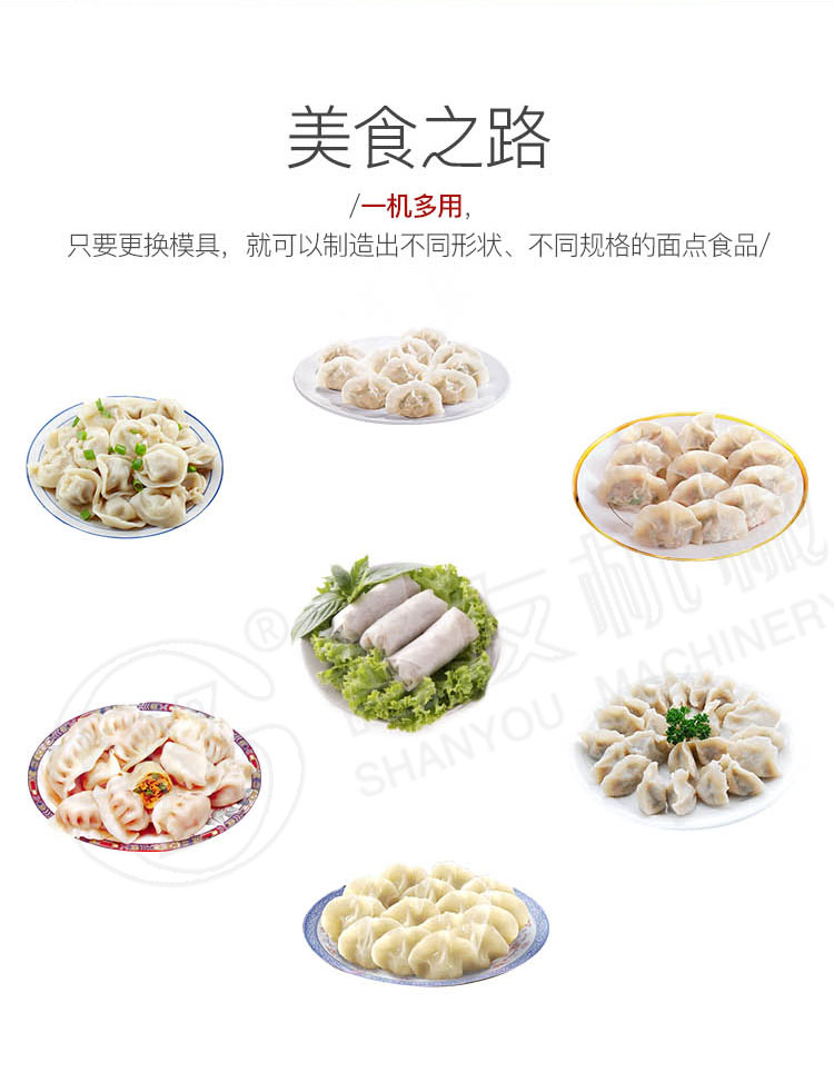 1. 一机多用途:只要更换模具,就可以制造不同的食品:春卷、馄饨、火锅水饺、珍珠水饺、咖喱饺子、花边饺子、锅帖饺子。