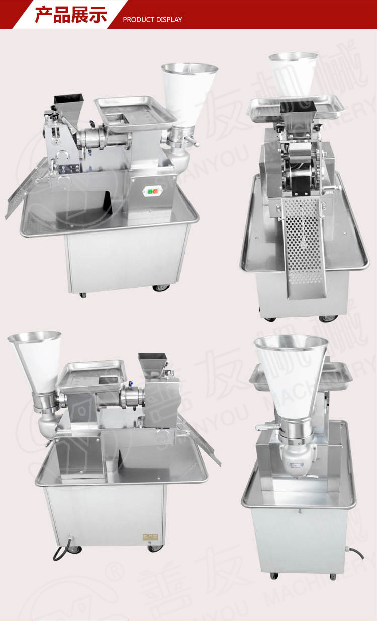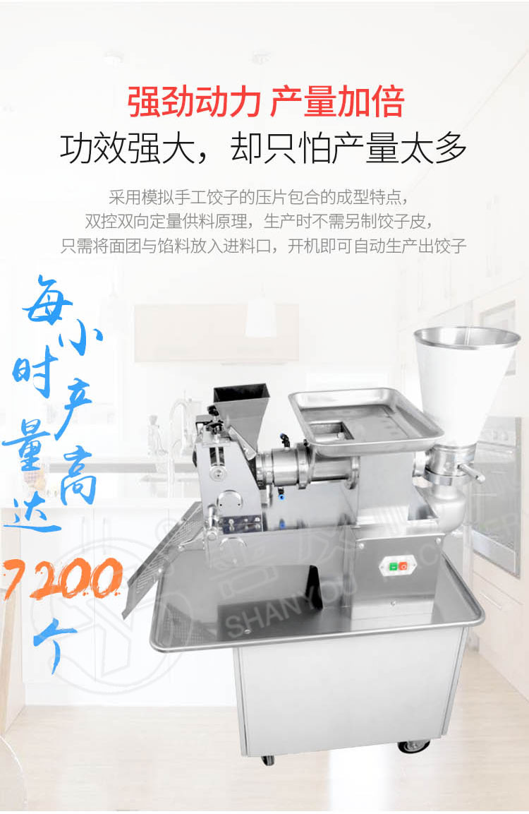 2. 面皮厚度与馅量可调整。 3. 适合多种调理: 包制出来的饺子可蒸、煮、炸、煎。春卷与咖喱角与咖喱卜油炸尤其可口。最重要的是均适合急速冷冻、耐贮藏,是理想的微波炉食品。 4. 操作简便省时省力: 人工制造饺子、春卷、锅贴、咖喱卜、咖喱角,耗时费工,尤其目前在劳工严重缺乏的情形下,更是令大多数的老板烦恼不已,这台机械操作简便,无经验者也可操作。制造速度快,不但省时而且省力。 5. 完美的设计,同时兼顾卫生与美观两大优点。 6. 拆装容易、清洗简便。 7. 结构精巧占地小: 机械尺寸: 990(长)×470(宽)×1150(高)毫米。重量:150公斤。 8. 产量高: 饺子:3,000-6,000个/时 春卷:1,500-3,000个/时 锅贴:2,000-4,000个/时 咖喱饺:2,000-5,000个/时 SY-JZJ系列饺子自动成型机,本机适用于宾馆、饭店、餐厅、团体食堂加工、幼儿园、速冻饺子生产。各种肉馅、肉菜混合馅、全菜馅及其它种馅的饺子。 |